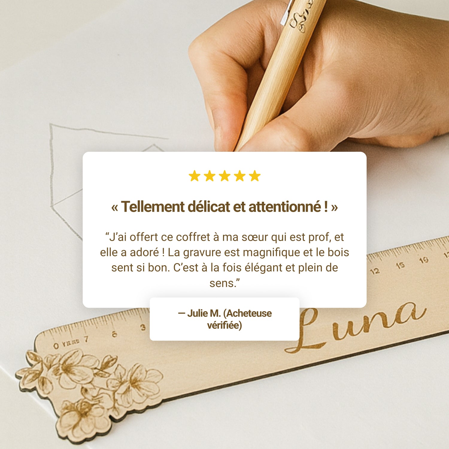 Toutes nos créations sont imaginées et gravées en France, dans notre atelier. Chaque pièce est réalisée avec soin à la main, dans le respect du bois et de l’émotion qu’elle véhicule.