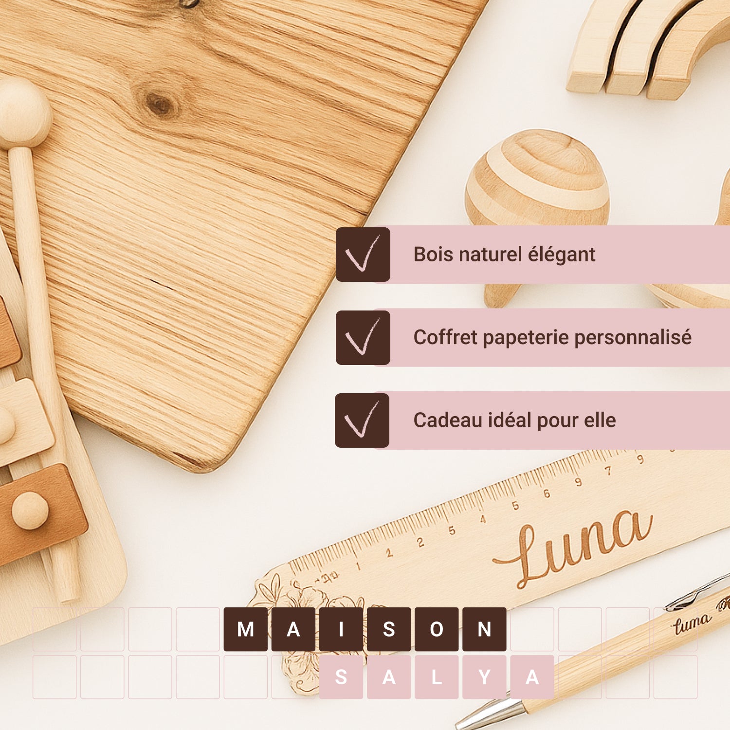 Fabriqué en bois naturel, il allie douceur, élégance et utilité le cadeau idéal pour une maman, une enseignante ou une amie.