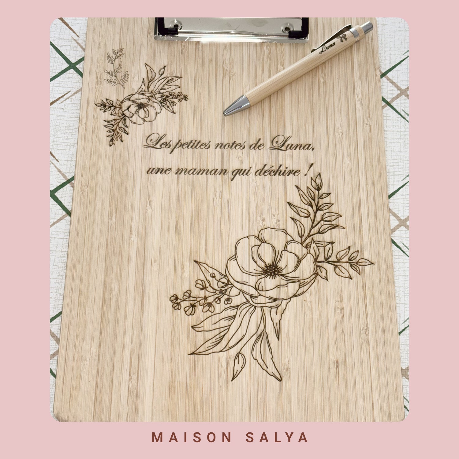 De l’idée à la gravure, chaque pièce Maison Salya™ naît d’un geste d’amour et d’un savoir-faire artisanal. Derrière chaque prénom gravé, il y a une émotion, une intention, une main qui façonne.