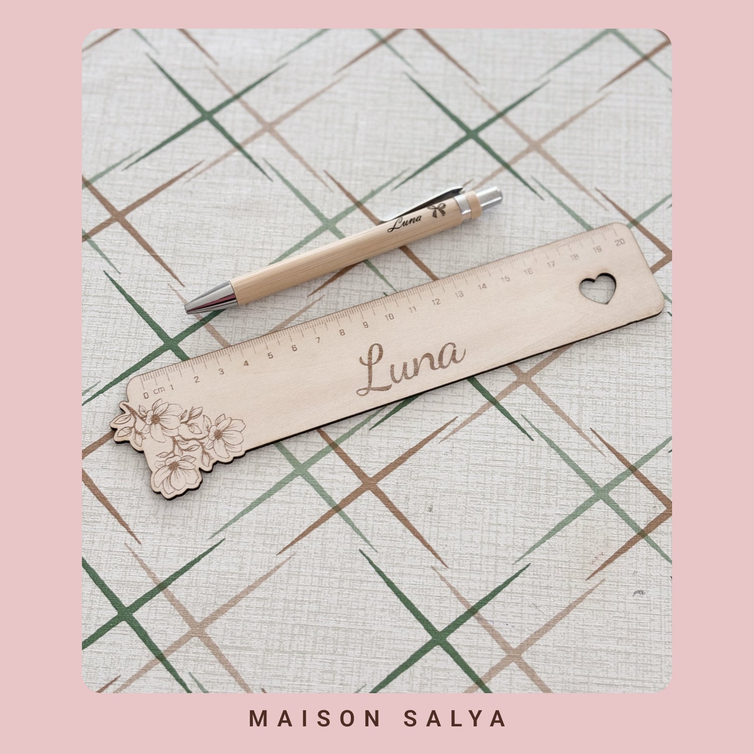 Chaque pièce: la planche à clip, le stylo et la règle est gravée au prénom de votre choix, pour un ensemble unique et attentionné.