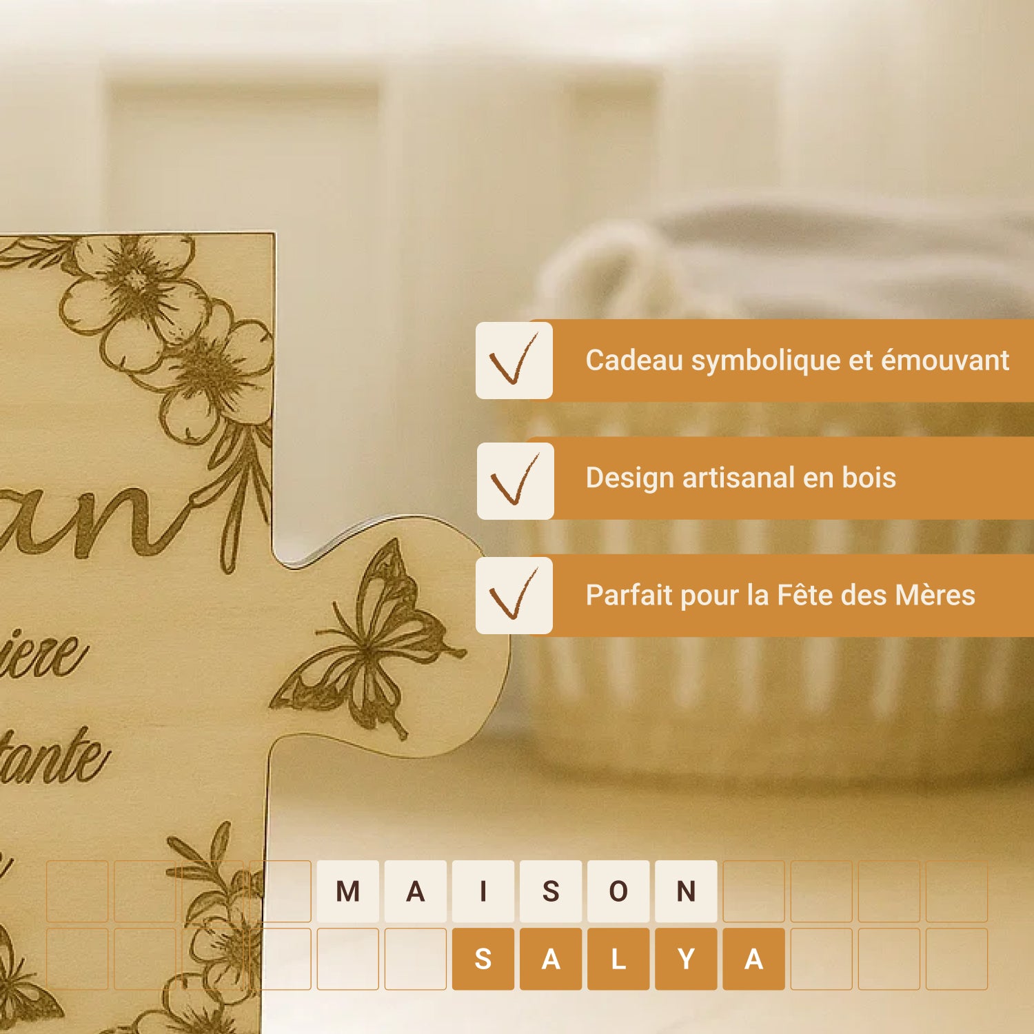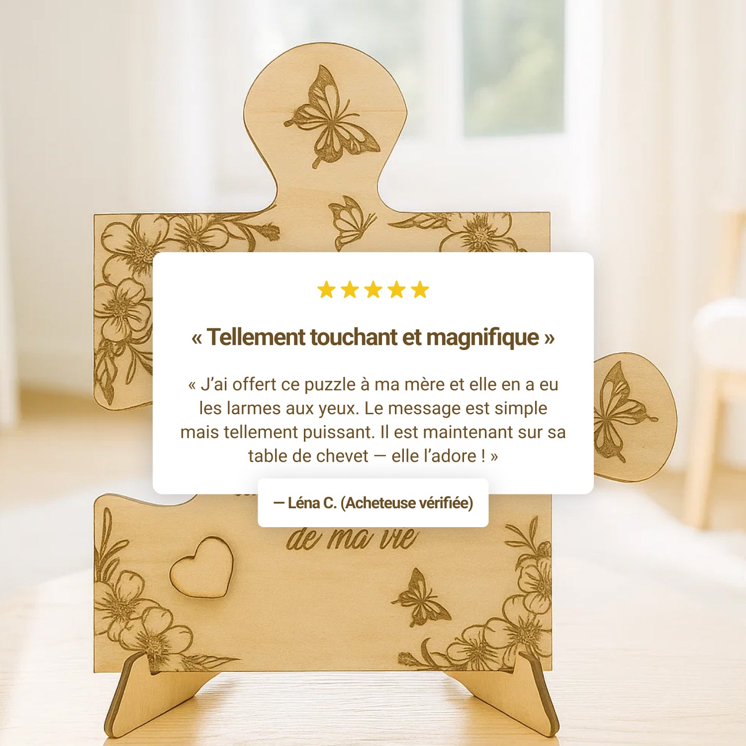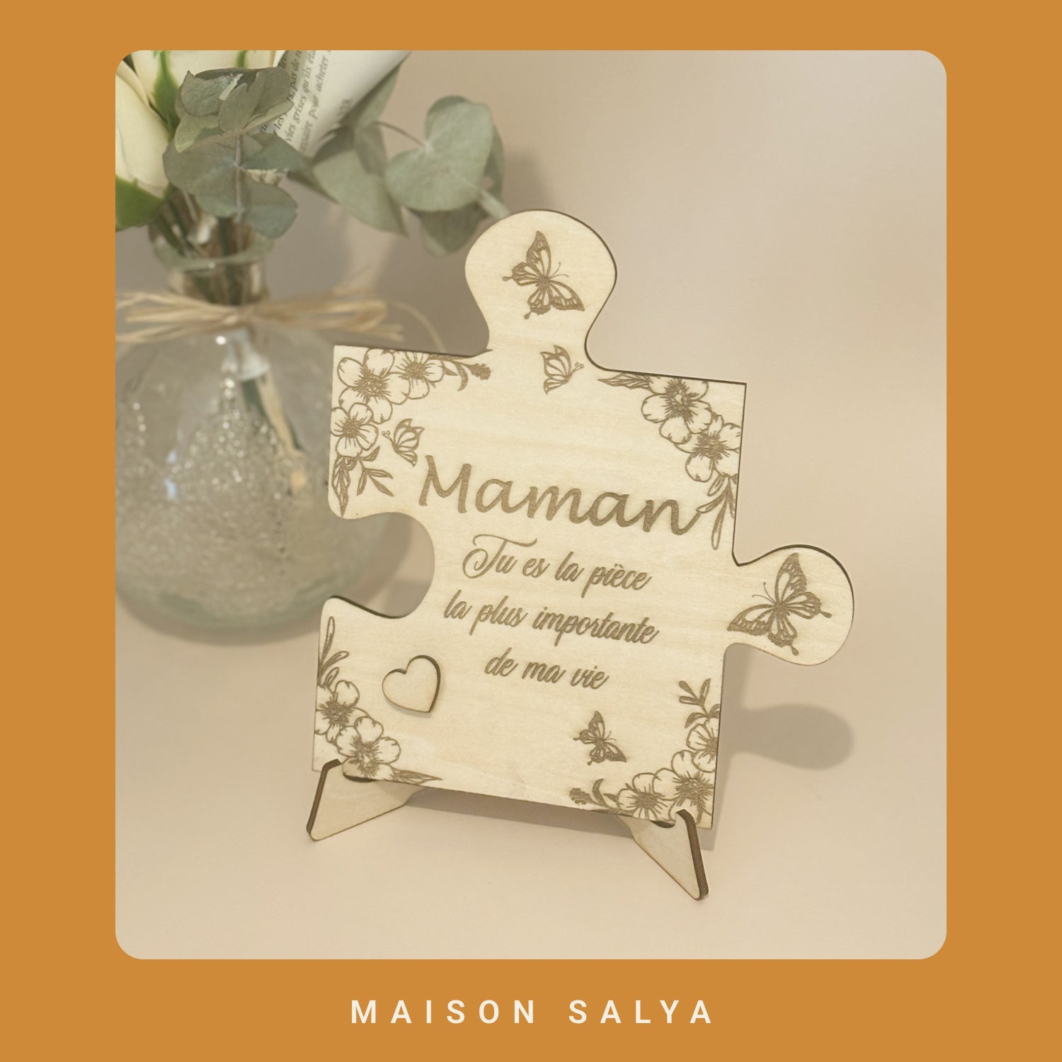 Gravée dans le bois avec tendresse, cette pièce de puzzle célèbre le lien précieux entre une mère et son enfant.