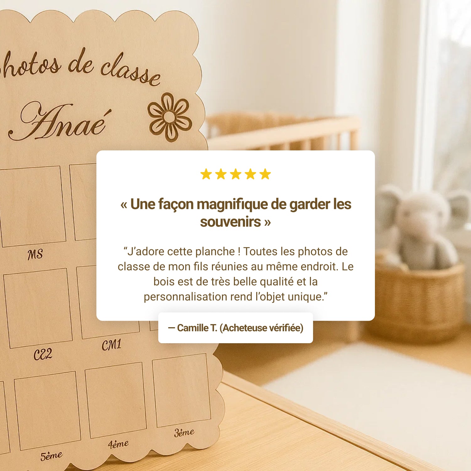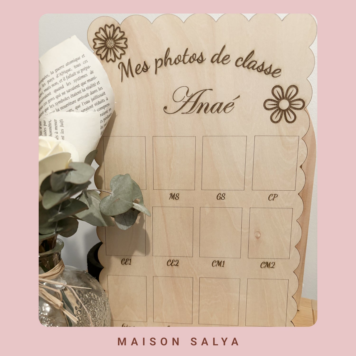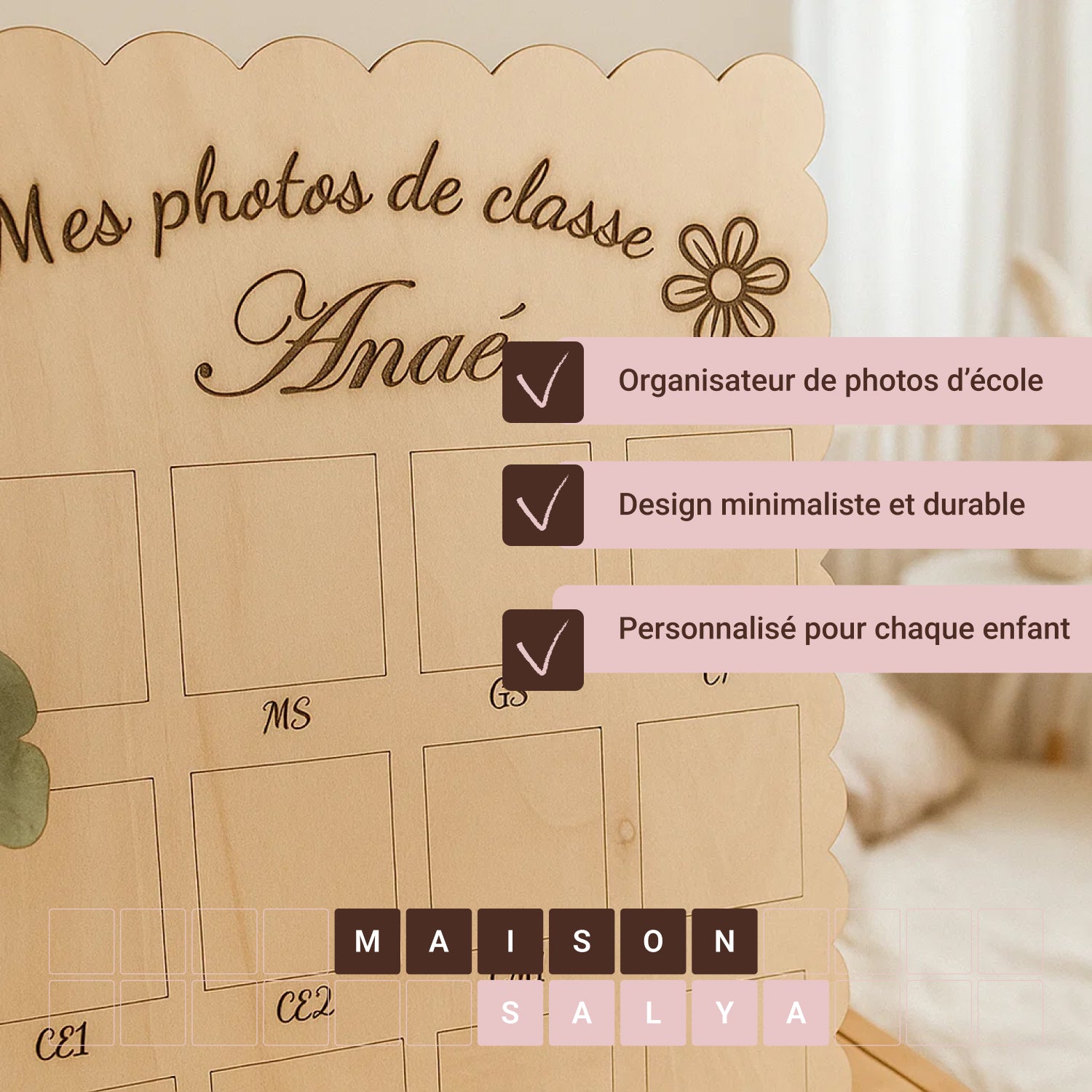 Ce tableau en bois gravé garde précieusement chaque photo de classe, de la maternelle au collège.